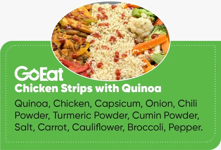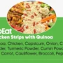 Quinoa, Chicken, Capsicum, Onion, Chili Powder, Turmeric Powder, Cumin Powder, Salt, Carrot, Cauliflower, Broccoli, Pepper.