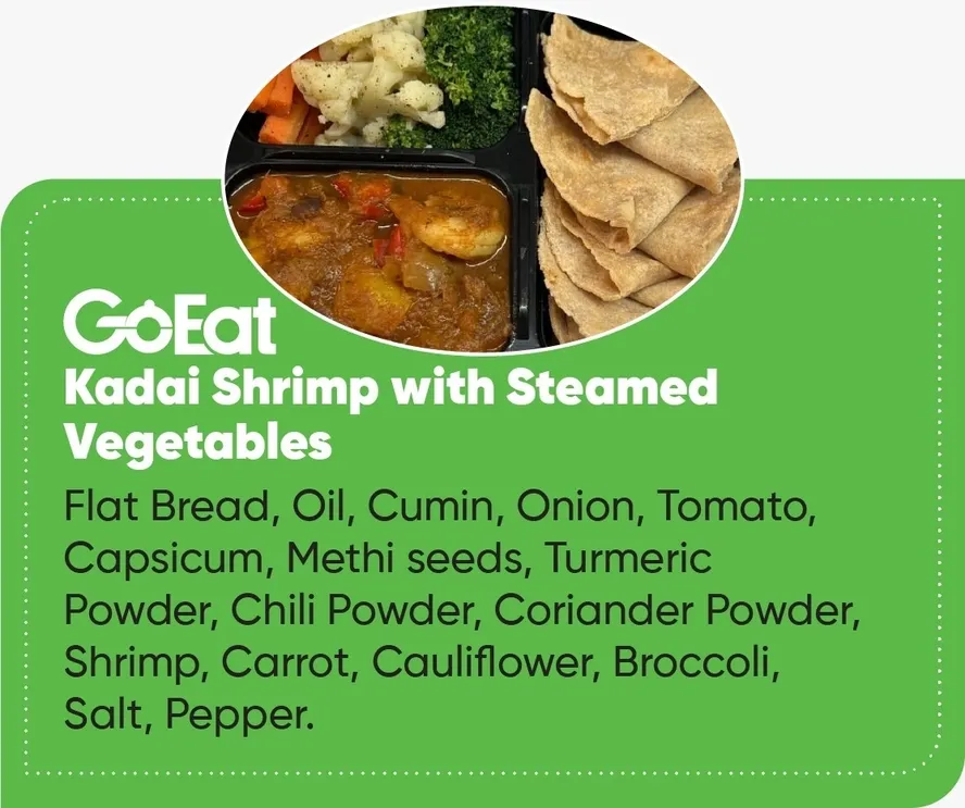 Flat Bread, Oil, Cumin, Onion, Tomato, Capsicum, Methi seeds, Turmeric Powder, Chili Powder, Coriander Powder, Shrimp, Carrot, Cauliflower, Broccoli, Salt, Pepper.