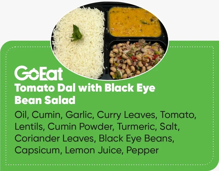A delicious meal featuring Tomato Dal with Black Eye Bean Salad. Ingredients include Oil, Cumin, Garlic, Curry Leaves, Tomato, Lentils, Cumin Powder, Turmeric, Salt, Coriander Leaves, Black Eye Beans, Capsicum, Lemon Juice, and Pepper.